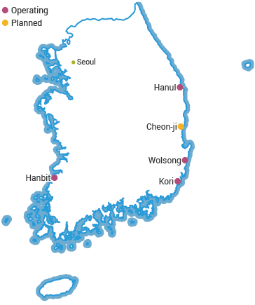 In November 2014 the government signed an agreement with Yeongdeok county in North Gyeongsang province 100 km north of Wolsong to build the new Cheon-ji plant, initially with two 1500 MWe APR+ reactors, possibly from 2022. Two more units were proposed (either there or at Daejin). For hosting the new plant, the county would receive payments totalling KRW 1.5 trillion ($1.3 billion) from KHNP over 60 years. In 2015 KEPCO said that Cheon-ji 1&2 would come online in December 2026 and December 2027. However, in the light of government policy in December 2017, KHNP has cancelled these four units.