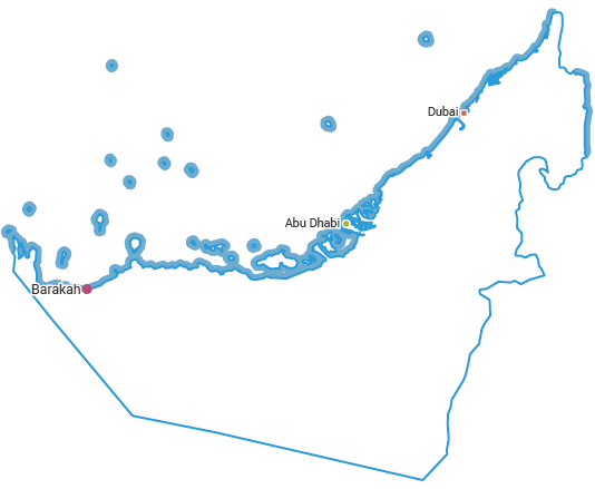 Nuclear power "emerged as a proven, environmentally promising and commercially competitive option which could make a significant base-load contribution to the UAE’s economy and future energy security." This led to creation of a regulatory framework and selection of a site between Abu Dhabi city and Ruwais, at Barakah, 250 km west of Abu Dhabi city. Another possible site mentioned then was Al Fujayrah on the Indian Ocean coast.