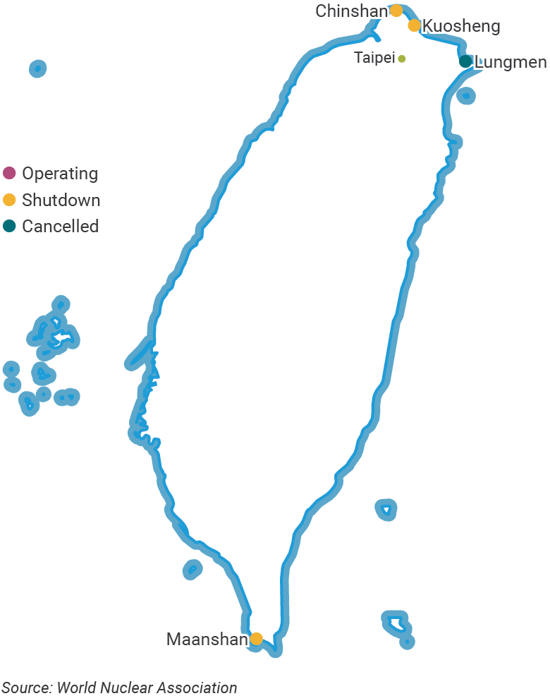 Six reactors were connected to the grid at three sites on the island between 1977 and 1985. In 2019 it was announced that the Chinshan plant would commence decommissioning, and in July 2021 Kuosheng 1 was shut down, followed by unit 2 in March 2023. Maanshan 1 was shut down in July 2024, followed by unit 2 in May 2025.