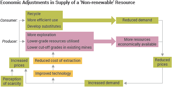 Conversely, the exhaustion of mineral resources during mining is real. Resource economists do not deny the fact of depletion, nor its long-term impact – that in the absence of other factors, depletion will tend to drive commodity prices up. But as we have seen, mineral commodities can become more available or less scarce over time if the cost-reducing effects of new technology and exploration are greater than the cost-increasing effects of depletion.