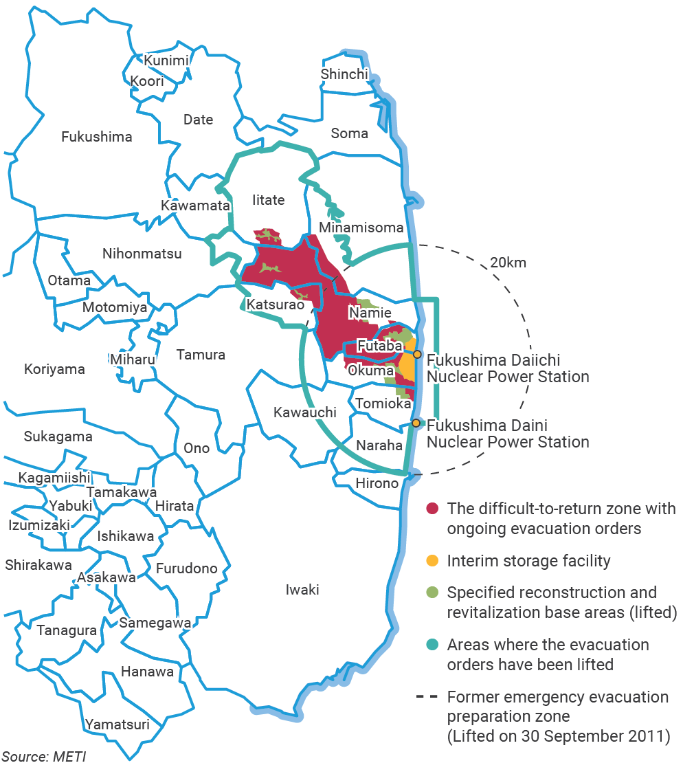 People within a radius of 20 km of the site and in other designated areas were evacuated, and those within a radius of 20-30 km were instructed to shelter before later being advised to voluntarily evacuate. Restrictions were placed on the distribution and consumption of food and the consumption of drinking water. Many people are still living outside the areas from which they were evacuated.