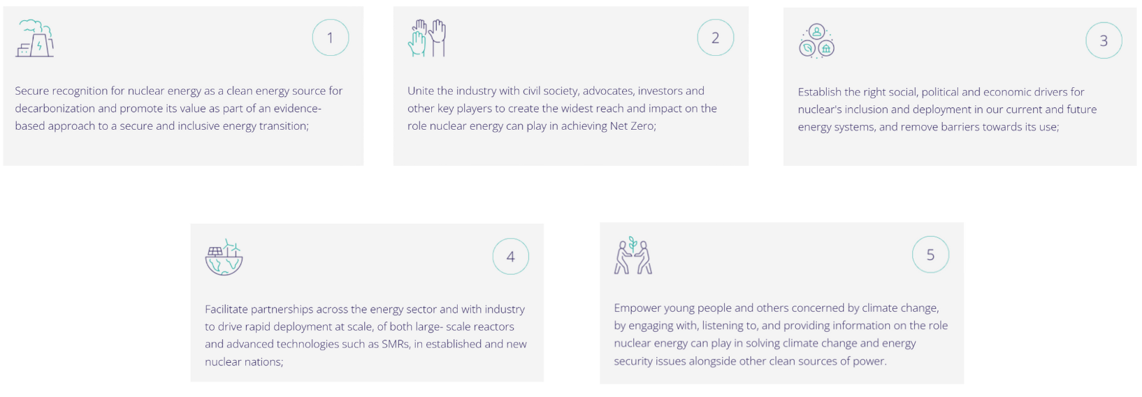- Ensure nuclear energy's potential is fully realized as we work to decarbonize our global energy systems, by promoting the value of nuclear energy and removing barriers to its growth.