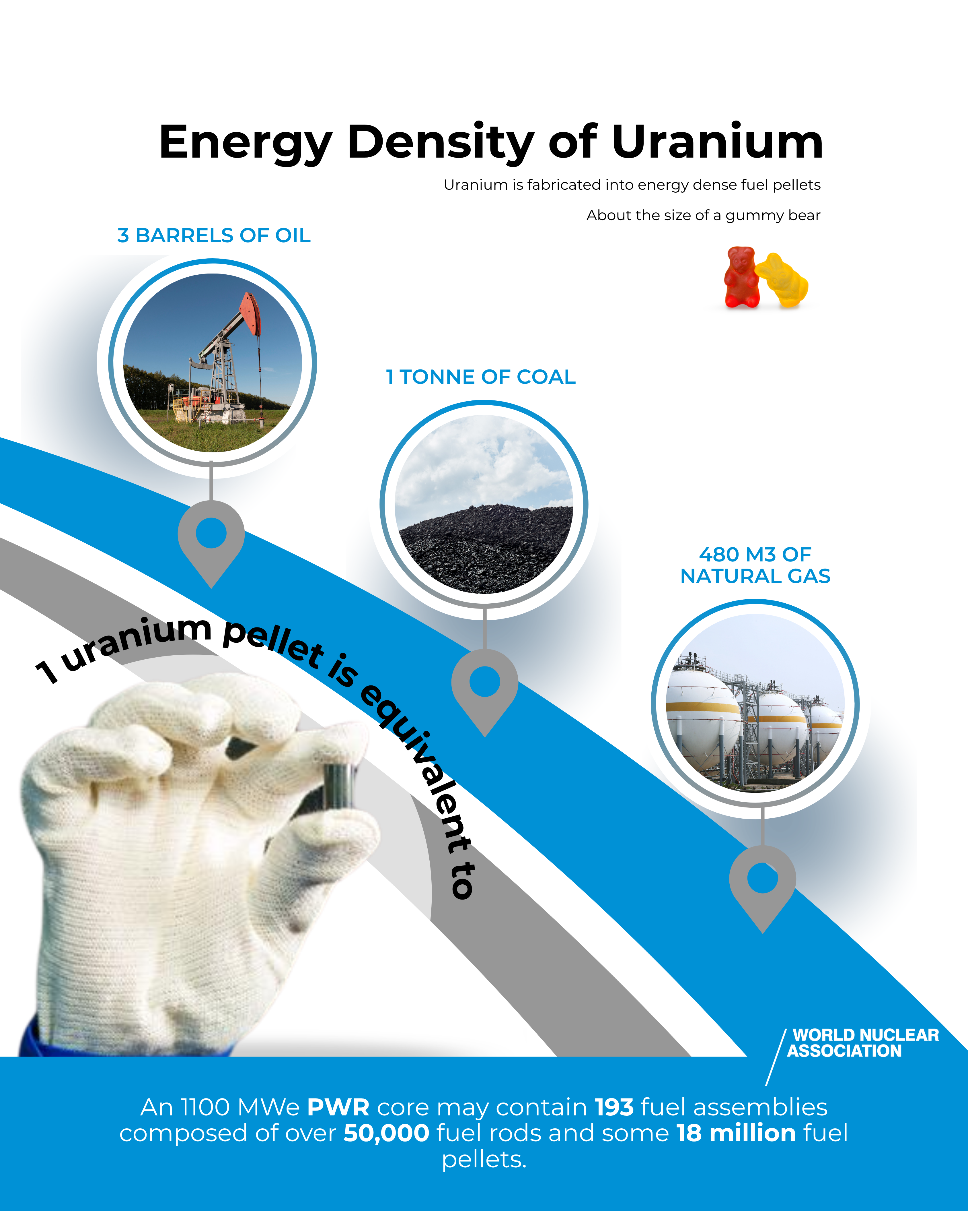 Fission Fact: A fingertip-sized uranium fuel pellet produces as much energy as three barrels of oil, more than 350 cubic metres of natural gas, and about half a tonne of coal. A 1 GWe power plant requires around 20-30 tonnes of uranium fuel annually, compared with over three million tonnes of coal.