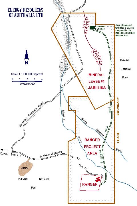 The Jabiluka 1 uranium deposit in the Northern Territory was discovered in 1971 by Pancontinental Mining Limited. In 1973 further drilling located the larger Jabiluka 2 uranium orebody about one kilometre to the east. Jabiluka lies 230 kilometres east of Darwin and 20 kilometres north of Ranger on the edge of the floodplain of Magela Creek, a tributary of the East Alligator River. It is surrounded by the Kakadu National Park, but the mine lease area is excluded from the National Park and adjoins the Ranger lease. Jabiluka 2 has resources in excess of 135 000 tonnes of uranium oxide, and is one of the world's larger high grade uranium deposits.